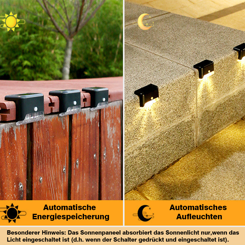 Diese kabellosen, wasserdichten Solarleuchten für Zäune lassen sich leicht an jeder Oberfläche anbringen, z. B. an Gartenwegen, Terrassentreppenstufen, Zäunen, Treppen und Geländern, ohne dass eine Verkabelung erforderlich ist.