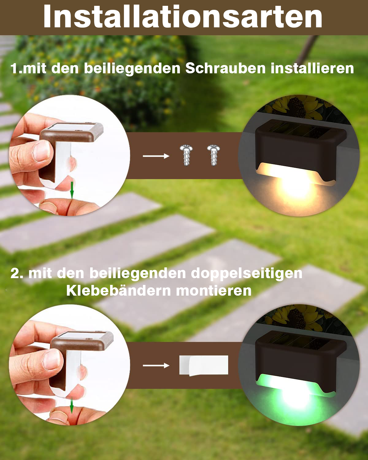 Diese wasserdichten Solarleuchten für Zaunstufen sind in zwei Farbvarianten erhältlich. Sie strahlen ein helles weißes Licht für eine saubere und gemütliche Umgebung und ein warmes gelbes Licht für eine gemütliche und angenehme Atmosphäre aus.